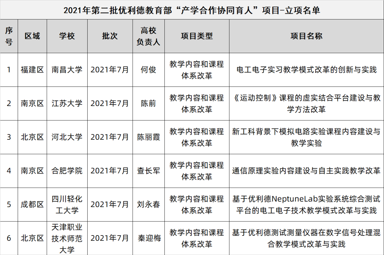 優(yōu)利德科技(中國)股份有限公司參加2021年產(chǎn)學(xué)合作協(xié)同育人項目,遴選出8所高校項目予以支持,經(jīng)教育部最終嚴(yán)格審核,我司通過項目立項數(shù)量為6項,具體立項名單情況公布如下: