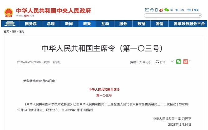 2021年12月24日,中華人民共和國主席根據全國人民代表大會及其常務委員會決定簽發(fā)《中華人民共和國主席令(第一〇三號)》,會議修訂通過了《中華人民共和國科學技術進步法》(后稱《科學技術進步法》)。