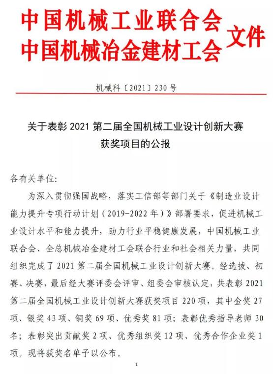 近日,由中國機械工業(yè)聯(lián)合會、全總機械冶金建材工會聯(lián)合行業(yè)和社會相關力量共同組織的2021年第二屆全國機械工業(yè)設計創(chuàng)新大賽完美落幕。本次大賽以深入貫徹強國戰(zhàn)略,落實工信部等部門關于《制造業(yè)設計能力提升專項行動計劃(2019-2022年)》部署要求,促進機械工業(yè)設計水平和能力提升,助力行業(yè)平穩(wěn)健康發(fā)展,備受行業(yè)贊譽與社會各界矚目。