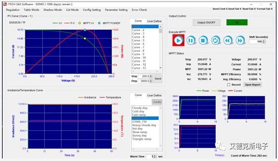 IT-M3900C SAS光伏模擬源選配SAS1000太陽能電池矩陣仿真軟件,可以精確地仿真太陽電池矩陣的I-V曲線,內(nèi)建EN50530、Sandia、NB/T32004、CGC/GF004、CGC/GF035 的SAS 模型,用戶簡單設(shè)定參數(shù)后,即可模擬I-V曲線輸出并生成報表,用于測試光伏逆變器的靜態(tài)和動態(tài)最大功率追蹤效能。用戶還可以編輯任何屏蔽最多可達4096個點的I-V曲線實現(xiàn)動態(tài)云遮效果,或存儲100條不同光照、溫度下的I-V曲線于內(nèi)存,并設(shè)定每條曲線執(zhí)行時間及執(zhí)行順序,以此來測試光伏逆變器在不同氣候條件下的長時間最大功率追蹤效能。