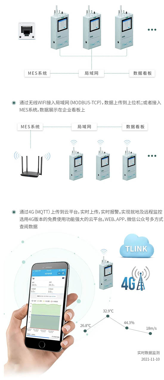 通過網口接入局域網(MODBUS-TCP),數據上傳到上位機;或者接入MES系統(tǒng),數據展示在企業(yè)看板上: