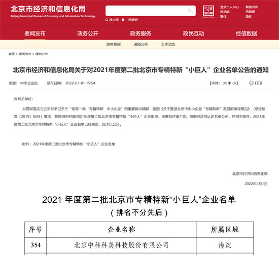 2022年3月1日,北京市經(jīng)濟和信息化局公示了2021年度第二批認定北京市專精特新“小巨人”企業(yè)名單。中科科儀控股公司中科科美成功入選。