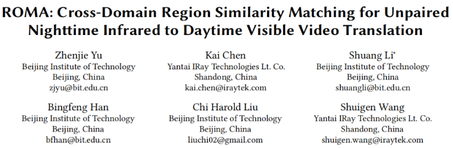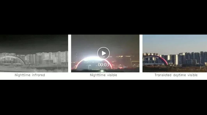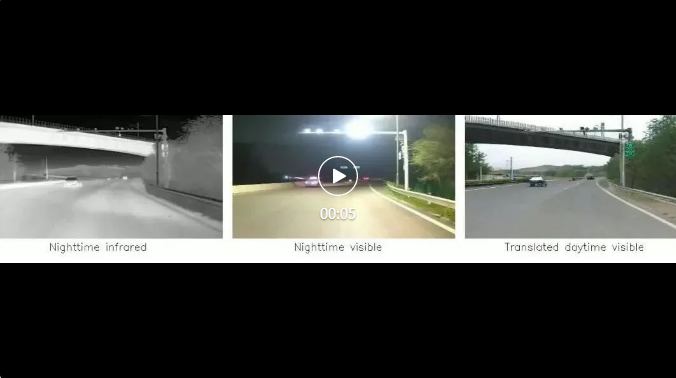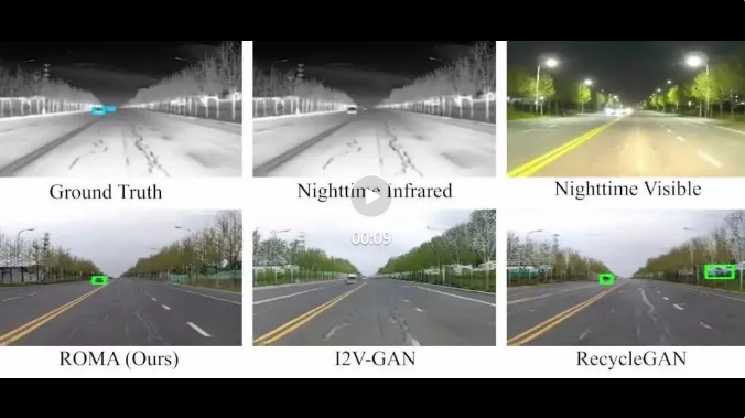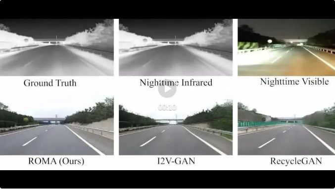 將夜間紅外的黑白世界轉(zhuǎn)化為日間人眼所見的世界,面臨重重困難和挑戰(zhàn):無法獲取的配對數(shù)據(jù)、不同的成像原理、不同的成像風(fēng)格、不同的場景等。ROMA算法幫助我們建立了翻譯的橋梁,從而可以跨越這些障礙,實現(xiàn)夜間熱成像向日間可見光的清晰流暢轉(zhuǎn)換。