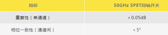 針對多通道自動測試系統(tǒng)、復雜鏈路矩陣等對高頻寬帶、高重復性、長壽命的多通路同軸開關需求,經過電科思儀微波開關技術團隊攻關,突破了多通道同軸開關寬帶匹配傳輸設計技術、高重復性設計技術等關鍵技術,將SP8T同軸開關工作頻率范圍提升至DC~50GHz,同時單通道重復性<0.05dB,通道間相位一致性<5°。典型測試曲線如圖2所示,重復性和相位一致性如表1所示。