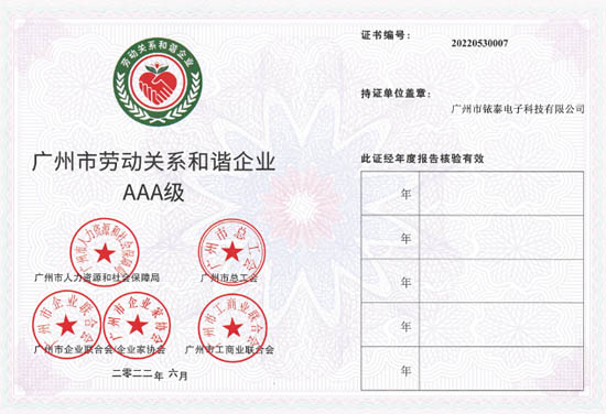 ?2022年經(jīng)廣州市人力資源和社會保障局、廣州市總工會、廣州市企業(yè)聯(lián)合會/企業(yè)家協(xié)會、廣州市工商業(yè)聯(lián)合會審核批準,銥泰科技獲 “廣州市勞動關系和諧企業(yè)AAA級”證書。