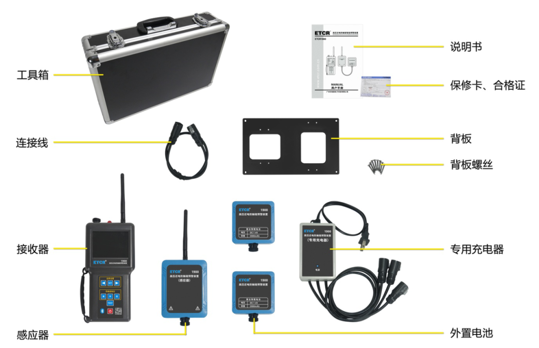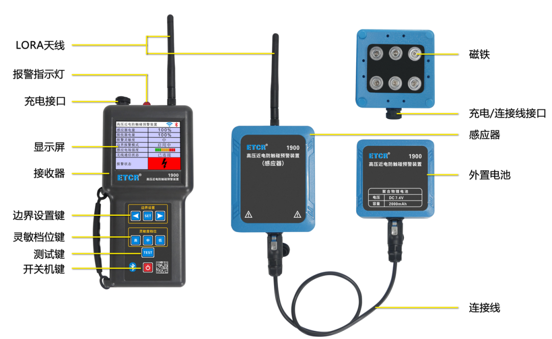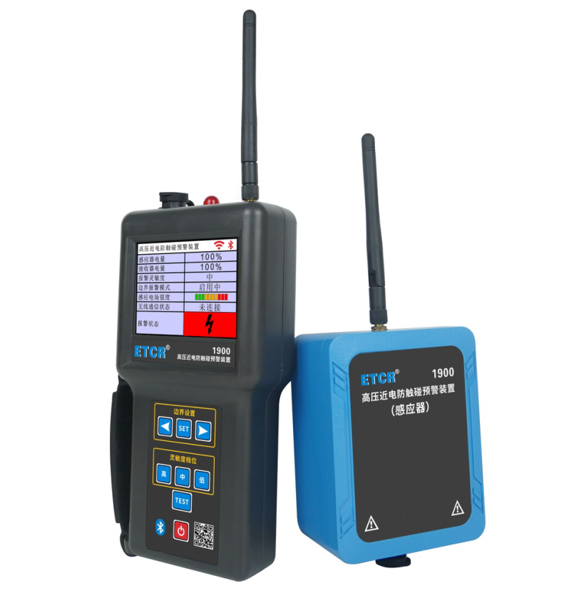 ETCR1900高壓近電防觸碰智能預(yù)警裝置由感應(yīng)器、外置電池、接收器、藍(lán)牙APP組成。感應(yīng)器采用非接觸感應(yīng)技術(shù)用于監(jiān)測高壓電場,接收器接受感應(yīng)器發(fā)送的監(jiān)測信號,當(dāng)電場強度達(dá)到設(shè)定的報警值時,觸發(fā)報警功能發(fā)出聲光報警及語音報警。感應(yīng)器與接收器采用無線通訊,傳輸距離200米。裝置具有報警靈敏度調(diào)節(jié)和邊界報警功能,用戶可在接收器設(shè)置報警靈敏度或自設(shè)定報警距離,以適應(yīng)復(fù)雜電場的環(huán)境。接收器具有藍(lán)牙功能,可查看報警信號或設(shè)置報警參數(shù)。