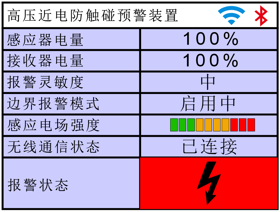 5)聲光報警功能:觸發(fā)報警功能時,接收器報警指示燈連續(xù)閃爍,蜂鳴器發(fā)出“嗶-嗶-嗶”,揚聲器播報語音提示”有電危險,請勿靠近”。