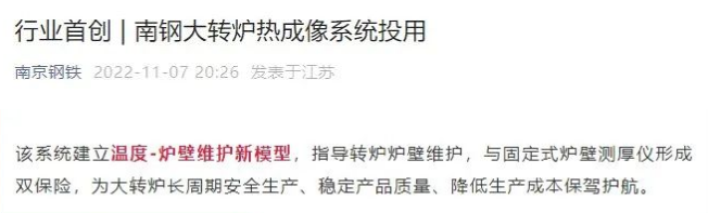 近日,格物優(yōu)信紅外熱成像儀及配套轉(zhuǎn)爐爐體熱成像預(yù)警系統(tǒng),在南鋼第一煉鋼廠3號(150噸)轉(zhuǎn)爐正式投用,這是熱成像儀在鋼鐵行業(yè)120噸以上大轉(zhuǎn)爐的首次應(yīng)用。轉(zhuǎn)爐爐體熱成像預(yù)警系統(tǒng)系統(tǒng)24小時(shí)持續(xù)運(yùn)行,能夠?qū)崟r(shí)檢測轉(zhuǎn)爐爐襯和耳軸的溫度變化,有效提升智能化安全監(jiān)測、數(shù)據(jù)自動(dòng)分析、精細(xì)化管理水平。