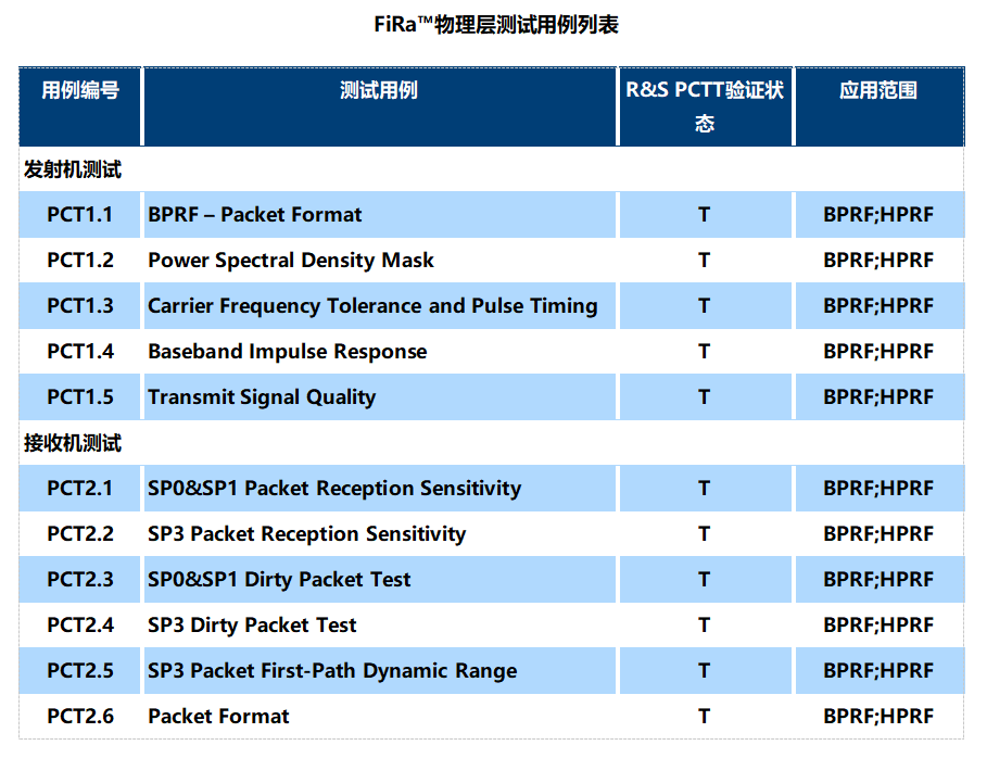 IEEE802.15.4z標(biāo)準(zhǔn)于2020年年底正式發(fā)布,802.15.4z增強HRP-ERDEV(Enhanced Ranging Device)定義了BPRF(base pulse repetition frequency)和 HPRF(Higher pulse repetition frequency)兩種模式。FiRa?物理層一致性測試適用于這兩種模式,包括接收機測試和發(fā)射機測試。具體用例列表如下所示: