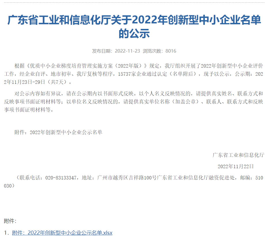 近日,據(jù)廣東省工業(yè)和信息化廳關(guān)于2022年創(chuàng)新型中小企業(yè)名單公示,經(jīng)企業(yè)自評(píng)、地市初審、省廳復(fù)核等程序,優(yōu)利德科技(中國(guó))股份有限公司(以下簡(jiǎn)稱“優(yōu)利德”)入選“2022年創(chuàng)新型中小企業(yè)”公示名單。