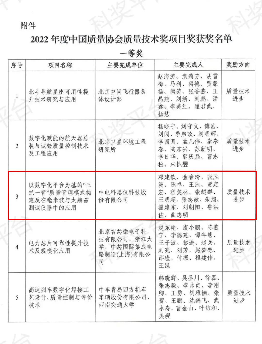 近日,2022年度中國(guó)質(zhì)量協(xié)會(huì)質(zhì)量技術(shù)獎(jiǎng)項(xiàng)目獎(jiǎng)結(jié)果正式出爐,電科思儀“以數(shù)字化平臺(tái)為基的‘三抓一管’質(zhì)量管理模式構(gòu)建及在毫米波與太赫茲測(cè)試儀器中的應(yīng)用”獲得質(zhì)量技術(shù)獎(jiǎng)一等獎(jiǎng)。