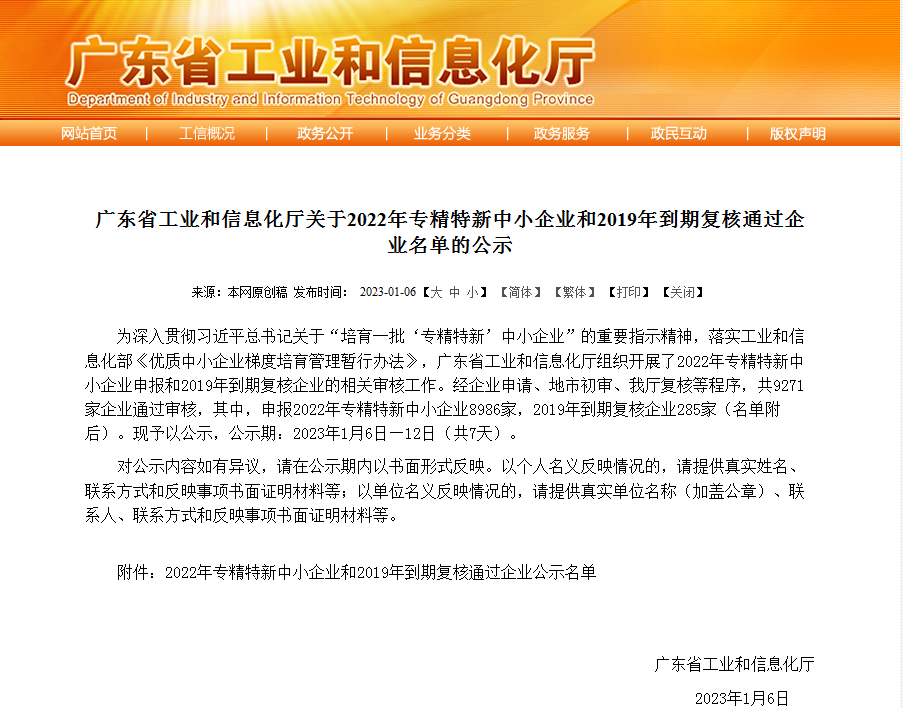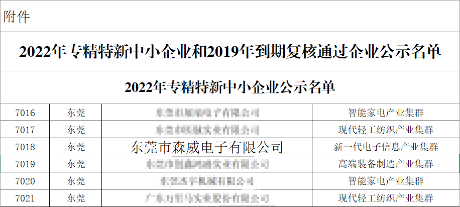 2023年1月6日,廣東省工業(yè)和信息化廳對(duì)2022年專(zhuān)精特新中小企業(yè)和2019年到期復(fù)核通過(guò)企業(yè)名單進(jìn)行公示,森威電子順利通過(guò)2022年廣東省“專(zhuān)精特新”中小企業(yè)認(rèn)定。