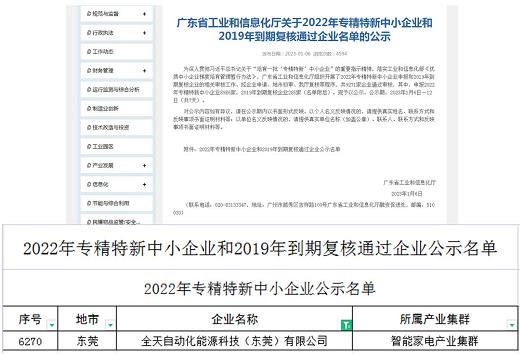 根據(jù)《廣東省工業(yè)和信息化廳關(guān)于2022年專精特新中小企業(yè)的通知》,全天自動化能源科技(東莞)有限公司(以下簡稱“APM全天科技”)參與了相關(guān)申報。經(jīng)企業(yè)自評、地市初審、省廳復(fù)核等程序,APM全天科技成功獲批2022年度廣東省“專精特新”企業(yè)資質(zhì)認(rèn)定!
