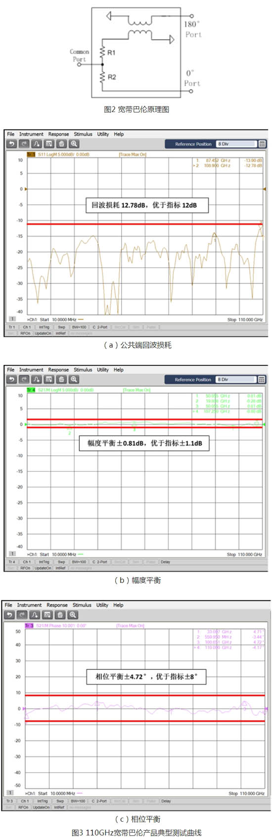 巴倫(Balun)是一種三端口器件,由同軸巴倫和功分電路構(gòu)成,可以雙向工作,用作信號分路器或合路器,實現(xiàn)單端—差分、差分—單端的平衡/不平衡轉(zhuǎn)換,工作原理如圖2所示。中電科思儀科技股份有限公司(簡稱“電科思儀”)一直致力于傳輸幅度平坦、幅相匹配優(yōu)異的寬帶巴倫產(chǎn)品的研發(fā)。110GHz寬帶巴倫產(chǎn)品典型測試曲線如圖3所示,性能優(yōu)異。