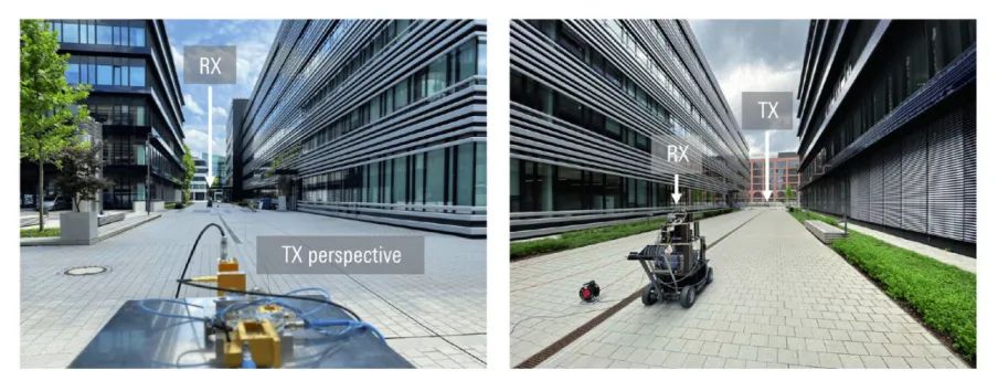圖:在慕尼黑羅德與施瓦茨總部的室外街道環(huán)境中,針對158 GHz(D波段)和300 GHz(H波段)進行角分辨太赫茲通道測量。