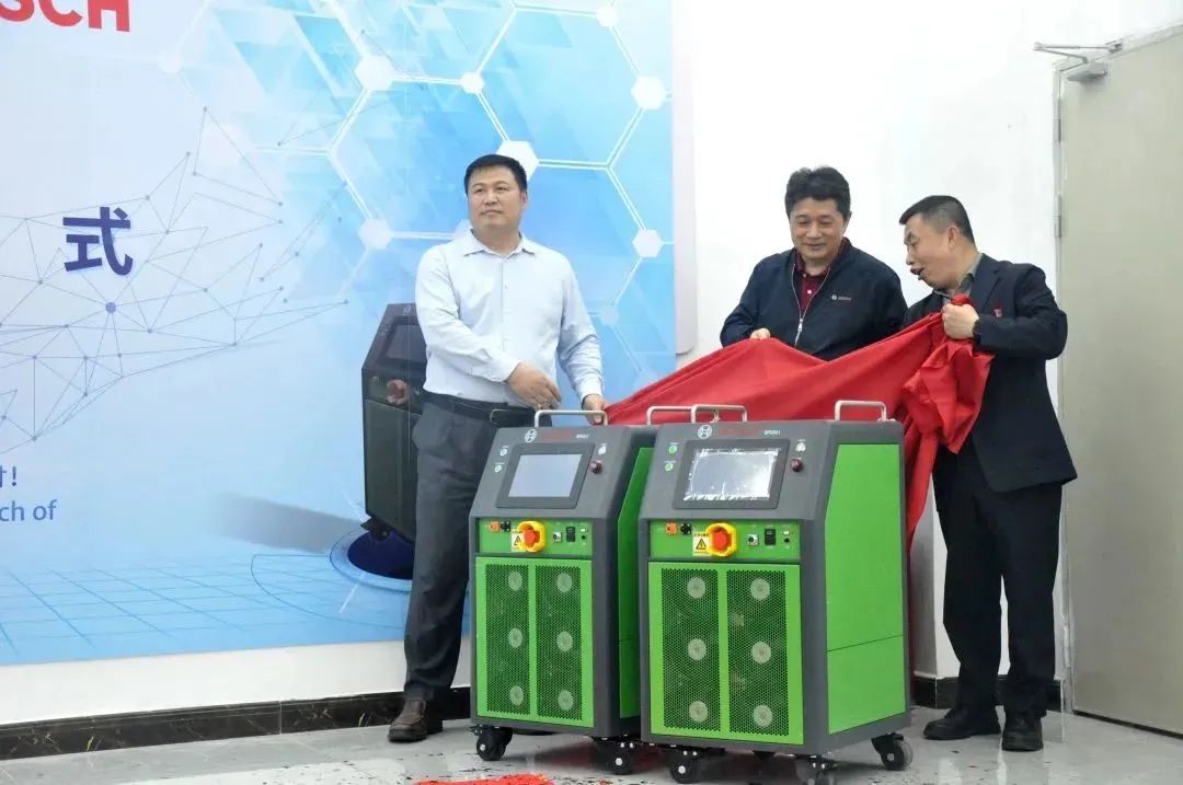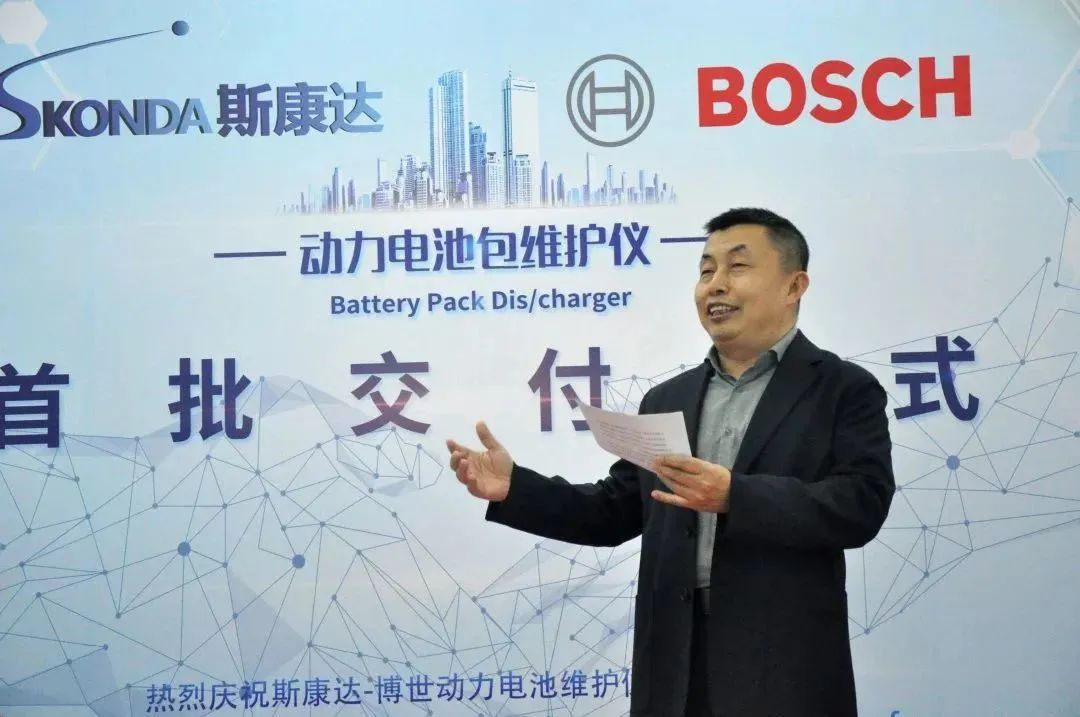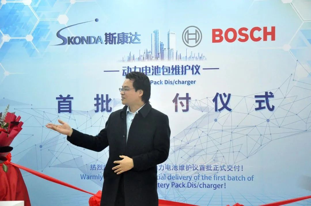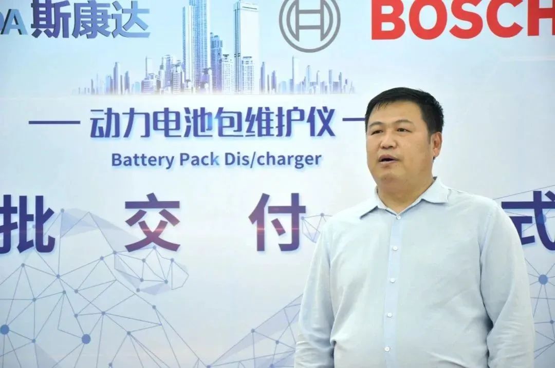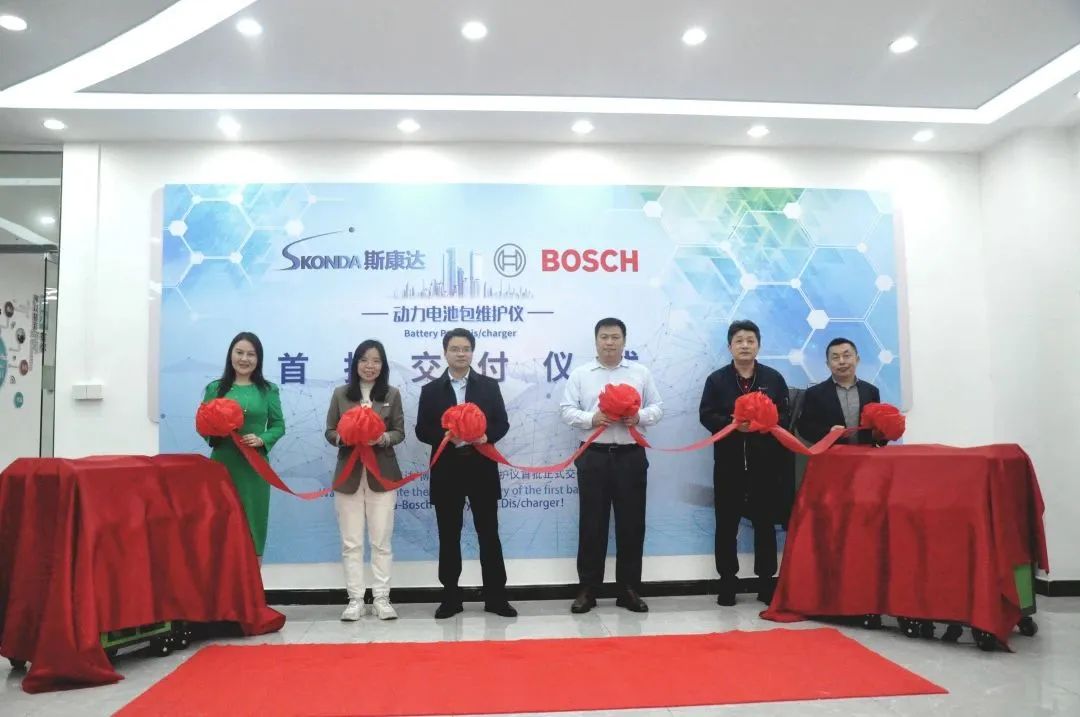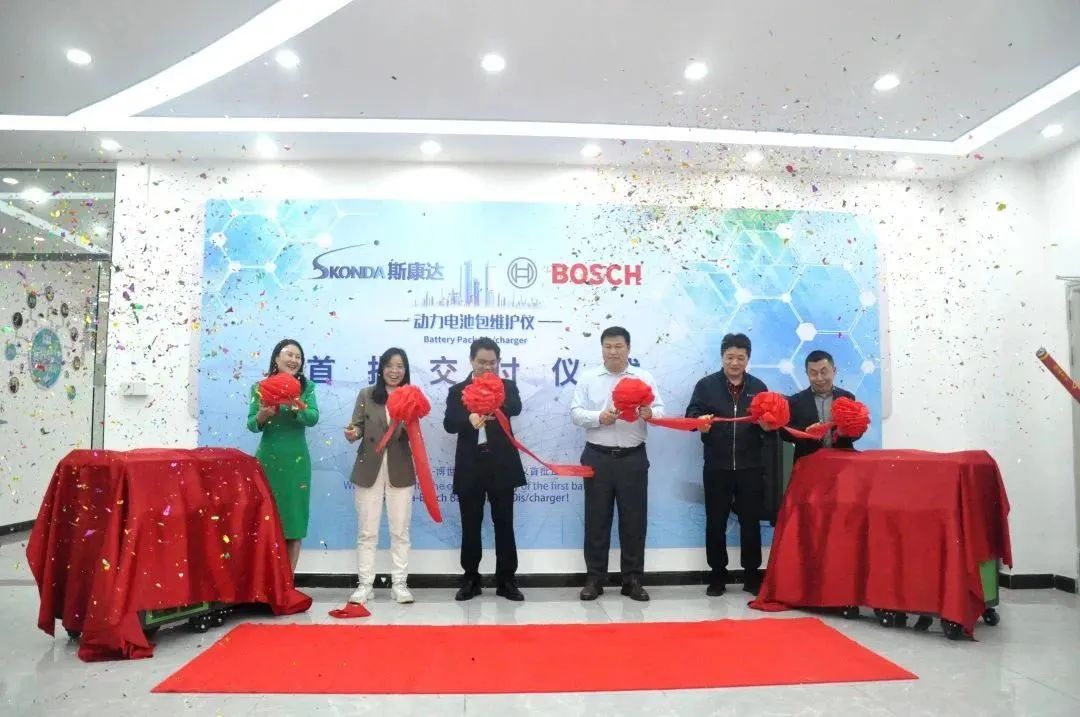 在隨后的儀式進(jìn)程中,斯康達(dá)電子有限公司的董事長(zhǎng)張玉喜、副總經(jīng)理栗杰、副總經(jīng)理王曉寧同來(lái)自博世集團(tuán)深圳分公司的項(xiàng)目經(jīng)理蘇芳、技術(shù)經(jīng)理陳玉泉和售后經(jīng)理高雷一起,為新的動(dòng)力電池包維護(hù)儀進(jìn)行了剪彩和揭幕儀式