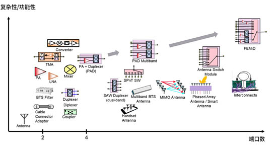 早期的通信設備通常采用的是多個分立元器件,包括濾波器、功放、雙工器等。隨著5G時代的到來,為實現(xiàn)高速率、低延遲、廣泛連接的要求,采用了MIMO、多天線等技術,從而要求元器件的尺寸越來越小、集成度越來越高,例如射頻前端模塊,就是將天線開關、放大器、雙工器、濾波器等集成在一起,元器件開始朝著多端口、高度集成化、更加復雜的方向發(fā)展,技術的復雜性呈指數(shù)級增長,因此也給相應的測試帶來了諸多挑戰(zhàn)。