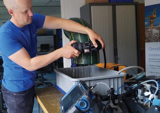 Mistras的工程師Jér?me Lethuillier正在使用FlexoFORM掃查器和OmniScan X3相控陣探傷儀對管道彎頭樣品進行檢測(圖片由CEM雜志提供)