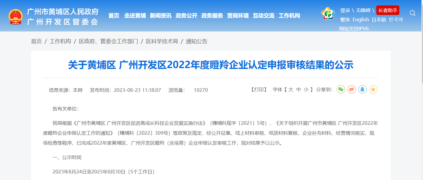 2023年8月30日,黃埔區(qū)科技局關(guān)于“關(guān)于黃埔區(qū) 廣州開發(fā)區(qū)2022年度瞪羚企業(yè)認(rèn)定申報(bào)審核結(jié)果”公示結(jié)束,廣州虹科電子科技有限公司成功通過認(rèn)定,榮獲黃埔區(qū)、廣州開發(fā)區(qū)2022年度瞪羚企業(yè)。