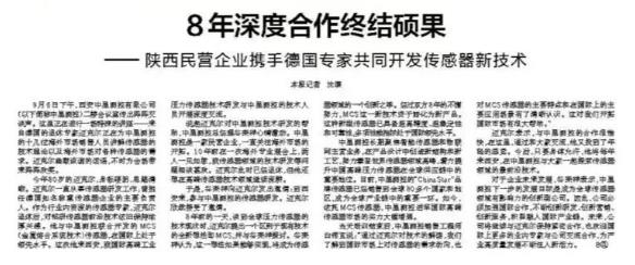 2023年10月5日,陜西省委機(jī)關(guān)報(bào)《陜西日報(bào)》當(dāng)天發(fā)行的報(bào)刊中刊登了《8年深度合作終結(jié)碩果——陜西民營企業(yè)攜手德國專家共同開發(fā)傳感器新技術(shù)》一文,重點(diǎn)對中星測控和德國傳感器專家邁克爾共同研發(fā)MCS(金屬熔合系統(tǒng)技術(shù))傳感器的起因、成果、目標(biāo)進(jìn)行了深度報(bào)道。具體報(bào)道內(nèi)容如下: