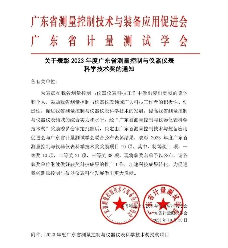 廣東省測量控制與儀器儀表科學技術(shù)獎旨在表彰在測量控制與儀器儀表科技工作中做出突出貢獻的集體和個人,鼓勵廣大科技工作者的積極性、創(chuàng)造性,促進我省測量控制與儀器儀表科學技術(shù)的發(fā)展,提高測量控制與儀器儀表領(lǐng)域的綜合實力和水平。2023年度廣東省測量控制與儀器儀表科學技術(shù)獎獎勵項目70項。其中,特等獎1項,一等獎10項,二等獎21項,三等獎38項。