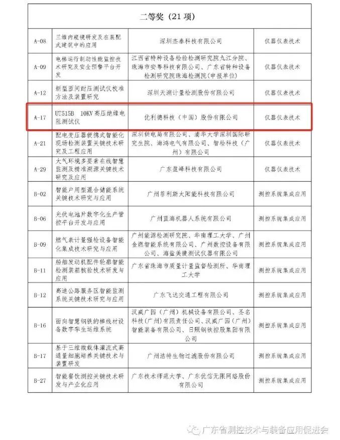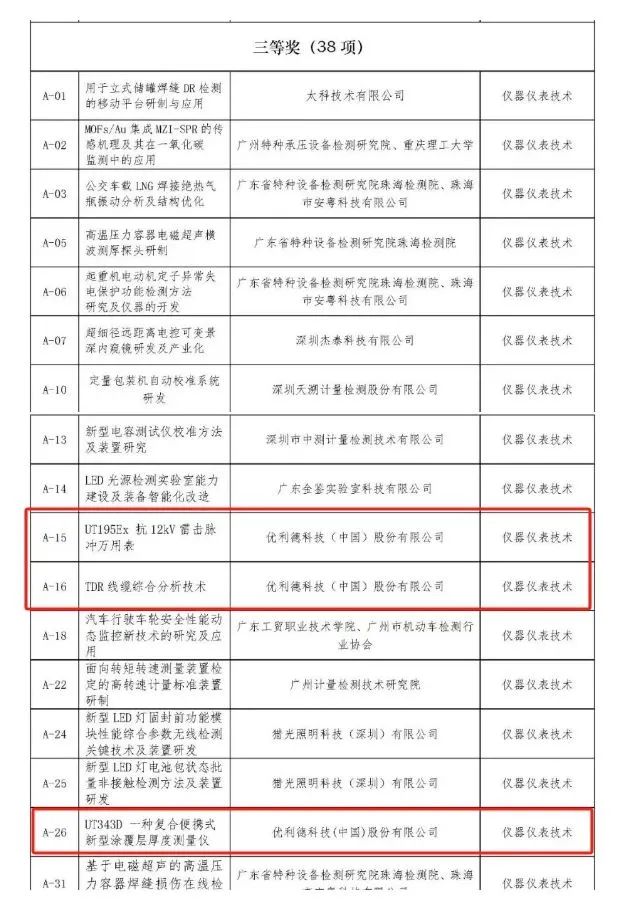 10月30日,廣東省測量控制與裝備應用促進會、廣東省計量測試學會聯(lián)合發(fā)布了《關(guān)于表彰2023年度廣東省測量控制與儀器儀表科學技術(shù)獎的通知》。根據(jù)通知,優(yōu)利德共摘取4項省級科學技術(shù)獎,其中:“UT515B 10KV高壓絕緣電阻測試儀”榮獲二等獎,“UT195Ex 抗12kV雷擊脈沖萬用表”、“TDR線纜綜合分析技術(shù)”、“UT343D一種復合便攜式新型涂覆層厚度測量儀”三個項目也分別榮獲三等獎,可喜可賀。