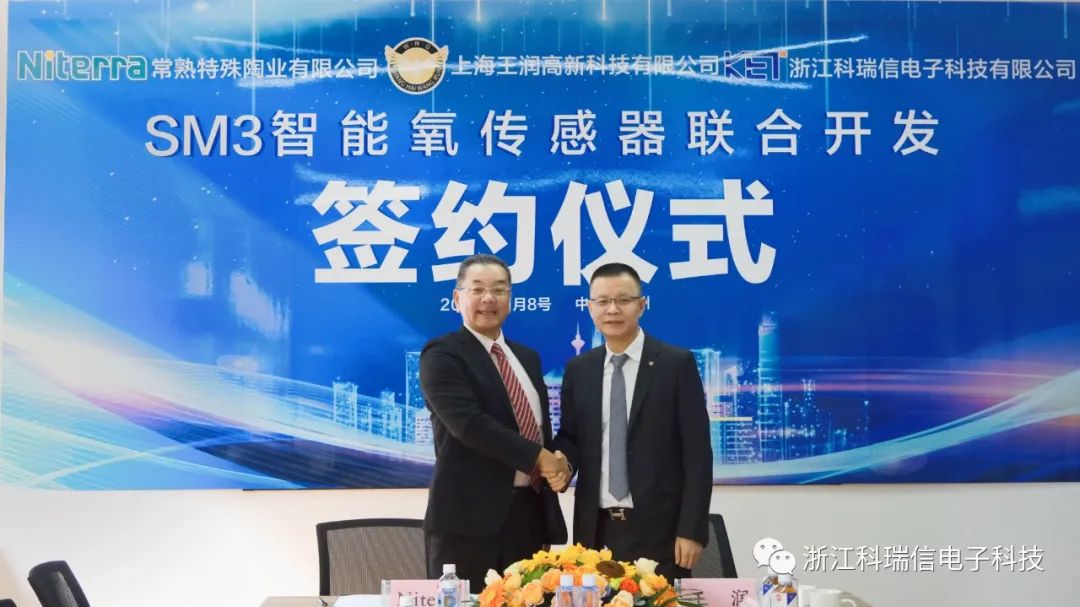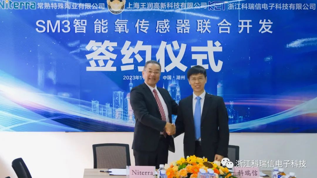 2023年11月8日,浙江科瑞信電子科技有限公司(簡(jiǎn)稱(chēng)“科瑞信”)攜手常熟特殊陶業(yè)有限公司(簡(jiǎn)稱(chēng)“Niterra”)和上海王潤(rùn)高新科技有限公司(簡(jiǎn)稱(chēng)“王潤(rùn)”)在浙江湖州隆重舉行SM3智能氧傳感器聯(lián)合開(kāi)發(fā)簽約儀式。