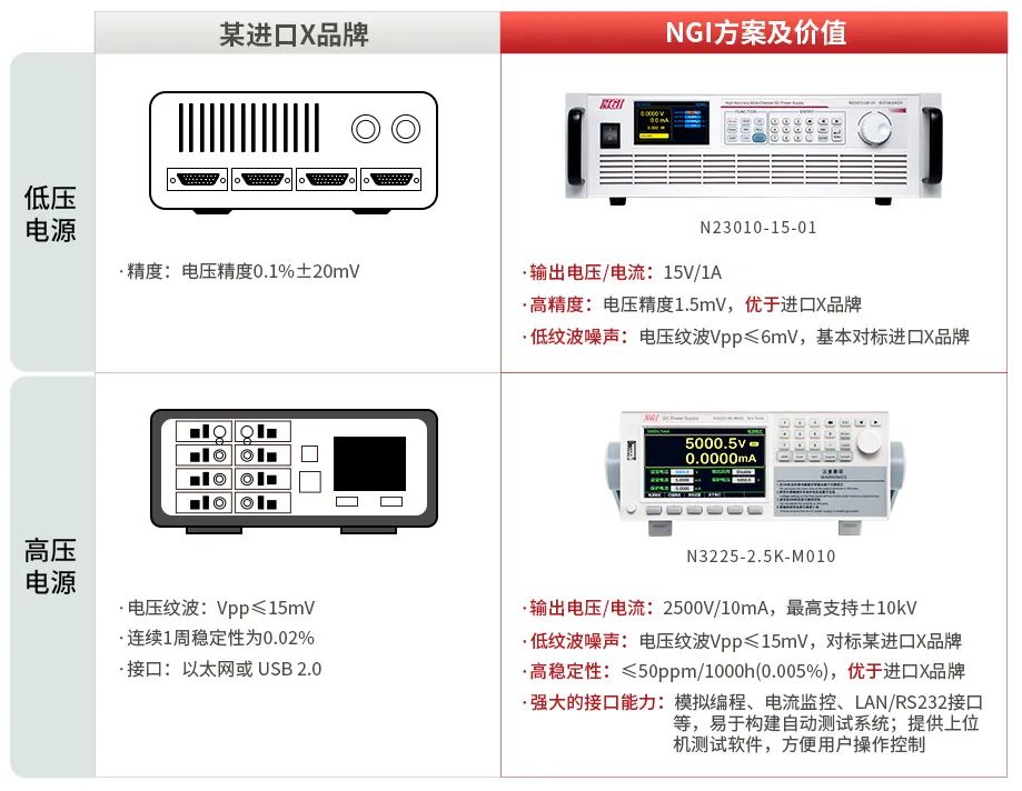 前期,A院使用某進口X品牌,在國家政策扶持和技術(shù)突圍下,高端儀器國產(chǎn)化勢在必行??蛻粼趯で髧a(chǎn)替代的過程中采用了N23010和N3200系列電源作為供電電源,提供試驗所需高低電壓,在精度、紋波、長時間穩(wěn)定性等方面全面對標(biāo)進口某X品牌。