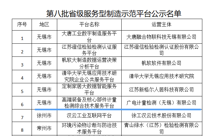 11月28日,江蘇省工業(yè)和信息化廳公布了第八批江蘇省服務(wù)型制造示范企業(yè)(平臺(tái))名單。廣電計(jì)量檢測(cè)(無錫)有限公司(簡(jiǎn)稱無錫廣電計(jì)量)依托“高端裝備及核心部件計(jì)量檢測(cè)綜合技術(shù)服務(wù)平臺(tái)”(以下簡(jiǎn)稱“平臺(tái)”)榮獲第八批“江蘇省服務(wù)型制造示范平臺(tái)”稱號(hào)。
