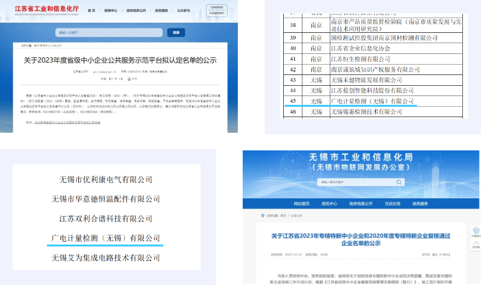 12月14日,江蘇省工信廳、無錫市工信局發(fā)布公告,廣電計量檢測(無錫)有限公司(簡稱“無錫廣電計量”)獲得“2023年度江蘇省級中小企業(yè)公共服務(wù)示范平臺(三星級)”和“江蘇省專精特新中小企業(yè)”兩項省級認(rèn)定,專業(yè)技術(shù)服務(wù)能力與產(chǎn)業(yè)服務(wù)成果再獲認(rèn)可。