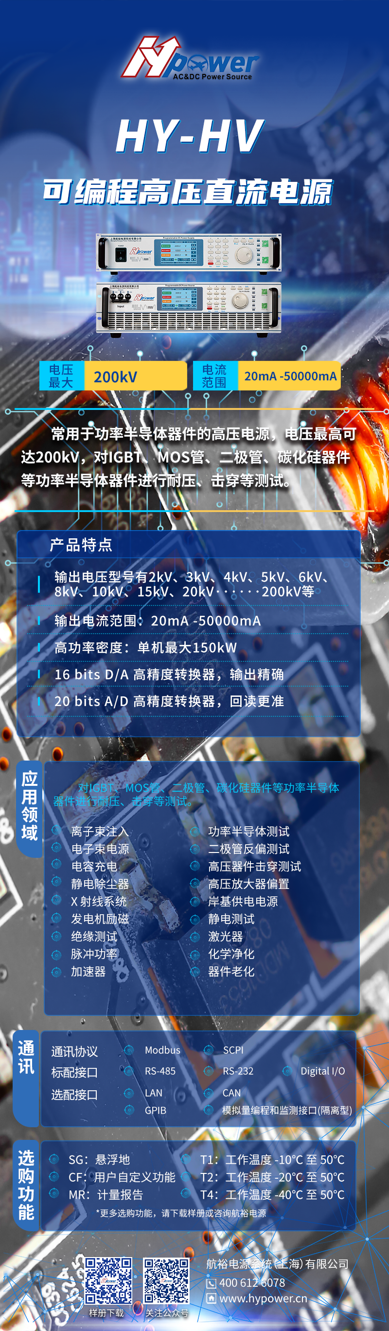 HY-HV系列可編程高壓直流電源一直以來備受用戶肯定,也是航裕電源的主營產品。近年來,用戶對于高壓需求的不斷提高,航裕電源2023年已交付多臺HY-HV可編程高壓直流電源,包括120kV、170kV等,拓寬HY-HV系列電源的高壓范圍至200kV,以滿足離子加速、超導試驗、高壓電容充放電、功率半導體、X射線系統(tǒng)、激光器、逆變器及高能物理研究等高壓測試需求。