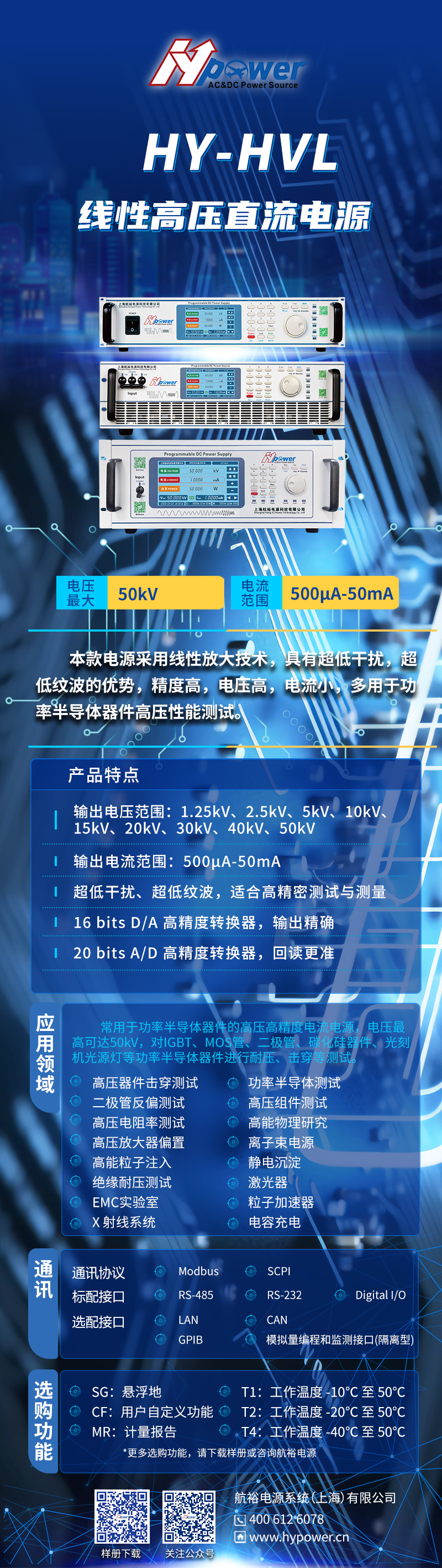 除了開關高壓直流電源以外,自2022年起,航裕電源已投產HY-HVL系列線性高壓直流電源,采用純線性技術,抗干擾能力強,紋波超低,全面升級電源純凈度。目前線性電源的高壓范圍是1.25kV-50kV,隨著用戶需求提升,HY-HVL系列的高壓瓶頸也將不斷突破。