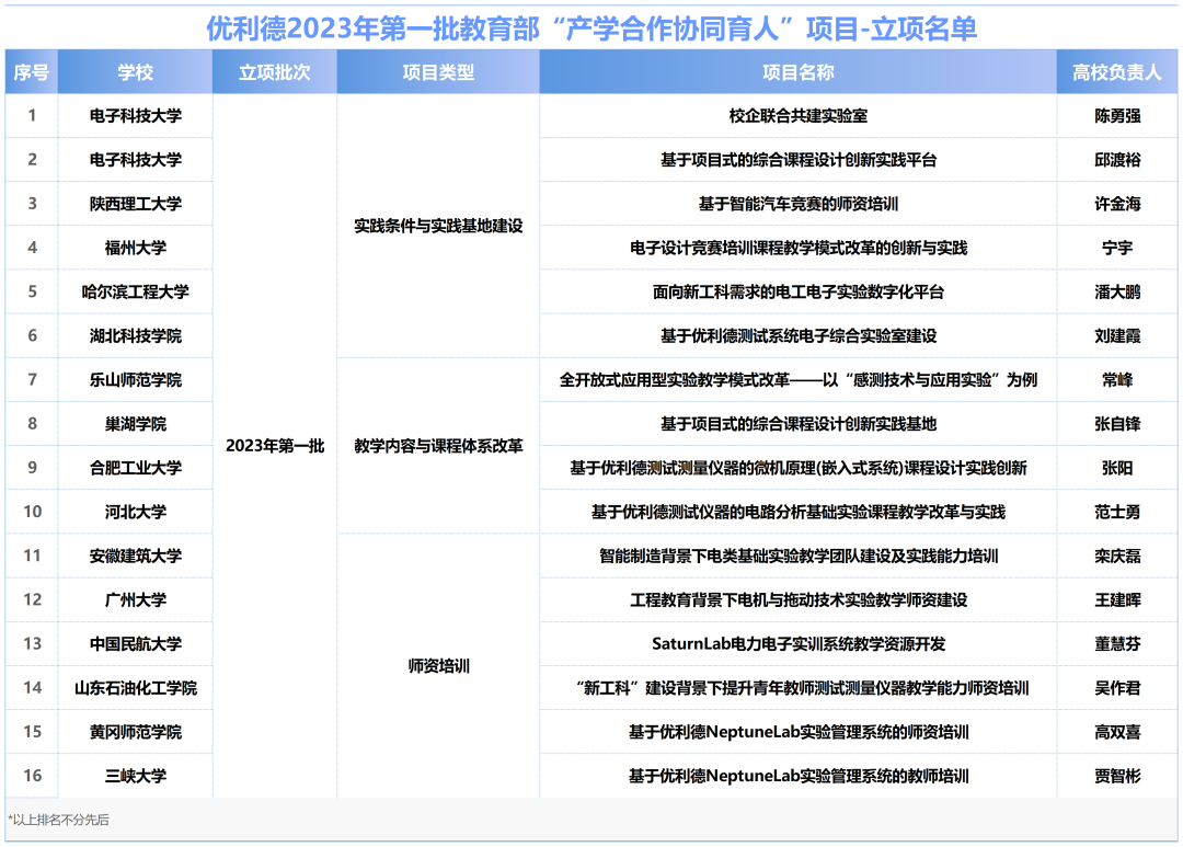 近日,教育部高等教育司發(fā)布《關(guān)于公布2023年產(chǎn)學(xué)合作協(xié)同育人項(xiàng)目立項(xiàng)名單的通知》(教高司函〔2023〕11號),優(yōu)利德科技(中國)股份有限公司16個項(xiàng)目獲批立項(xiàng),項(xiàng)目內(nèi)容包括【實(shí)踐條件與實(shí)踐基地建設(shè)】、【教學(xué)內(nèi)容與課程體系改革】和【師資培訓(xùn)】。