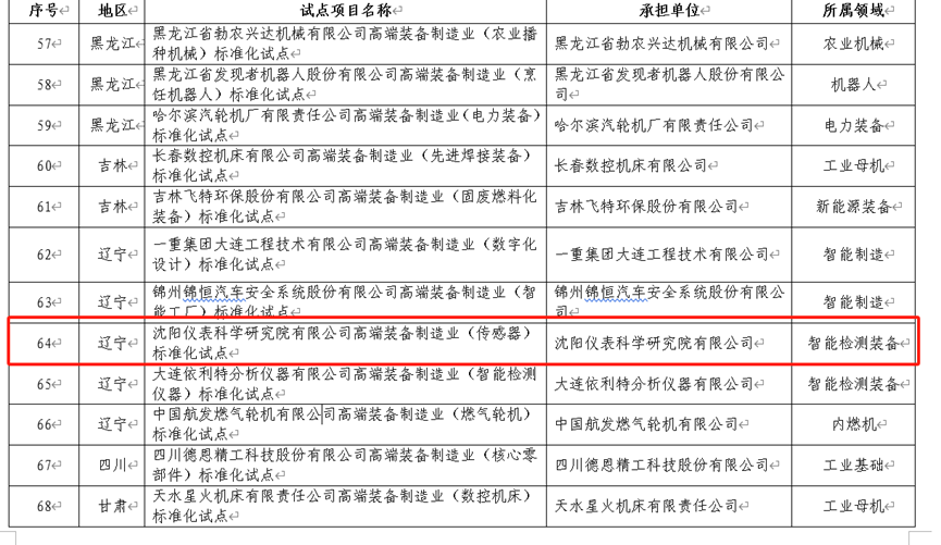 近日,國家標(biāo)準(zhǔn)化管理委員會(huì)發(fā)布了擬下達(dá)的第三批國家高端裝備制造業(yè)標(biāo)準(zhǔn)化試點(diǎn)項(xiàng)目的公示名單,沈陽儀表科學(xué)研究院有限公司高端裝備制造業(yè)(傳感器)標(biāo)準(zhǔn)化試點(diǎn)項(xiàng)目榜上有名。