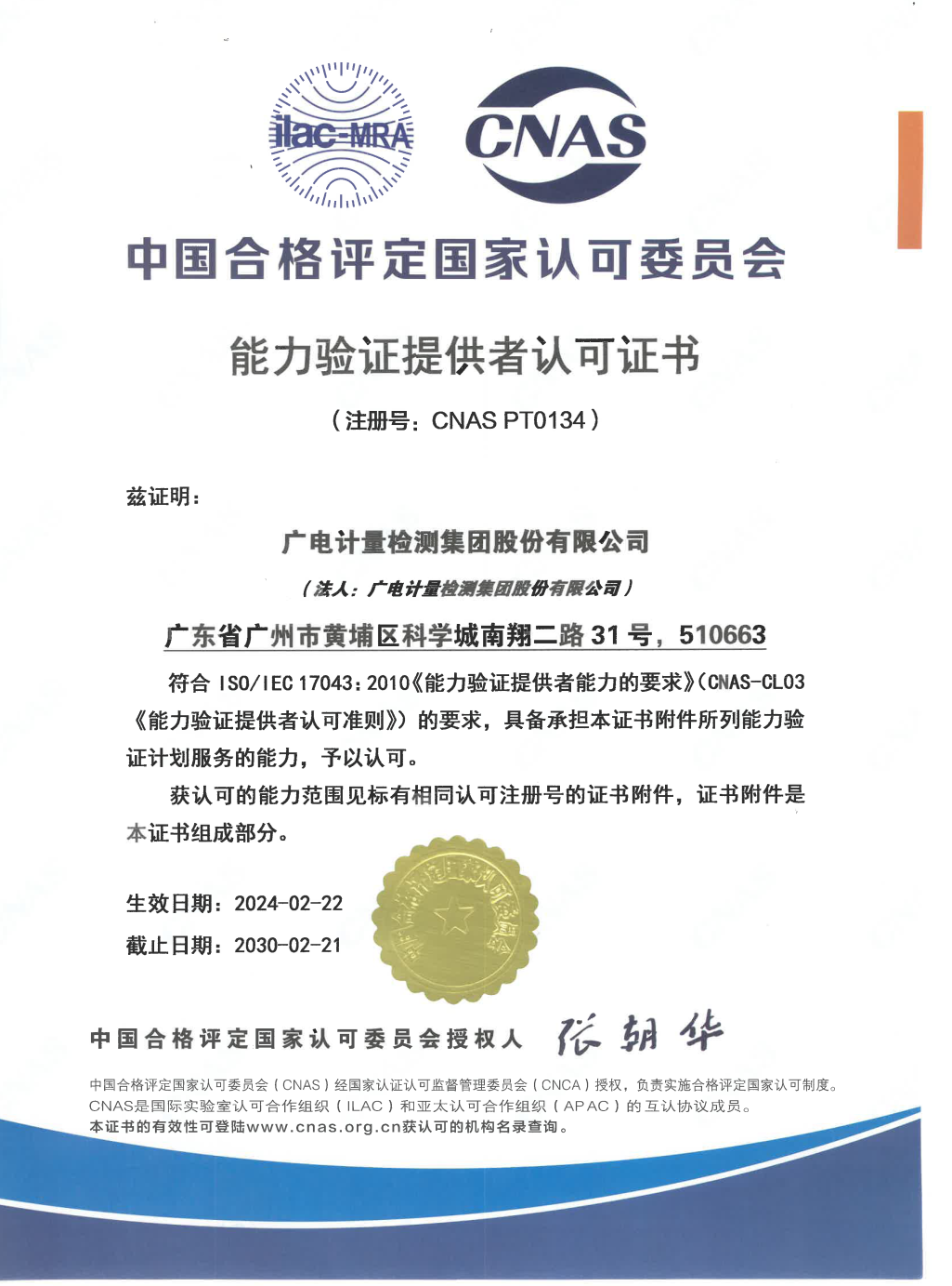 近日,廣電計(jì)量獲得由中國(guó)合格評(píng)定國(guó)家認(rèn)可委員會(huì)(CNAS)頒發(fā)的能力驗(yàn)證提供者(PTP)認(rèn)可證書(shū)(注冊(cè)編號(hào):CNAS PT0134),正式成為具有CNAS PTP認(rèn)可資質(zhì)的能力驗(yàn)證提供者。