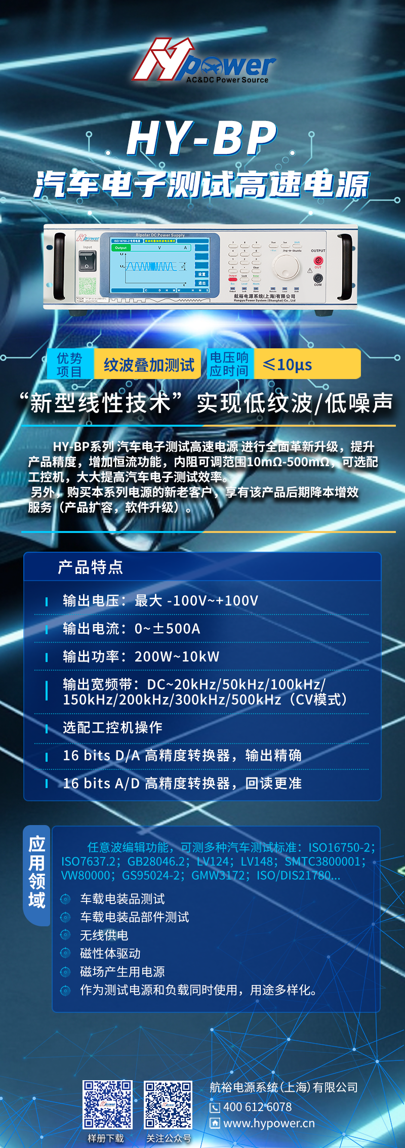 航裕電源對(duì)于汽車電性能測(cè)試和新能源汽車高壓系統(tǒng)測(cè)試提供智能便捷的測(cè)試方案,技術(shù)經(jīng)驗(yàn)豐富純熟,備受業(yè)界肯定 。本次,航裕電源攜最新迭代產(chǎn)品亮相本次盛會(huì),為汽車工業(yè)注入更多航裕力量。