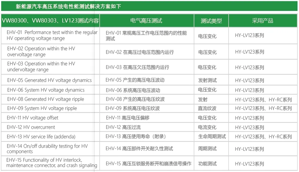 新能源汽車(chē)中應(yīng)用了多種高壓系統(tǒng),高壓系統(tǒng)在高頻運(yùn)行中,會(huì)不斷自產(chǎn)生高壓紋波,這十分影響電動(dòng)汽車(chē)高壓部件功能的穩(wěn)定性。測(cè)試法規(guī)LV123正是因此而生,其中定義了針對(duì)高壓零部件的電性能特性和安全測(cè)試的標(biāo)準(zhǔn)要求和測(cè)試方法。
