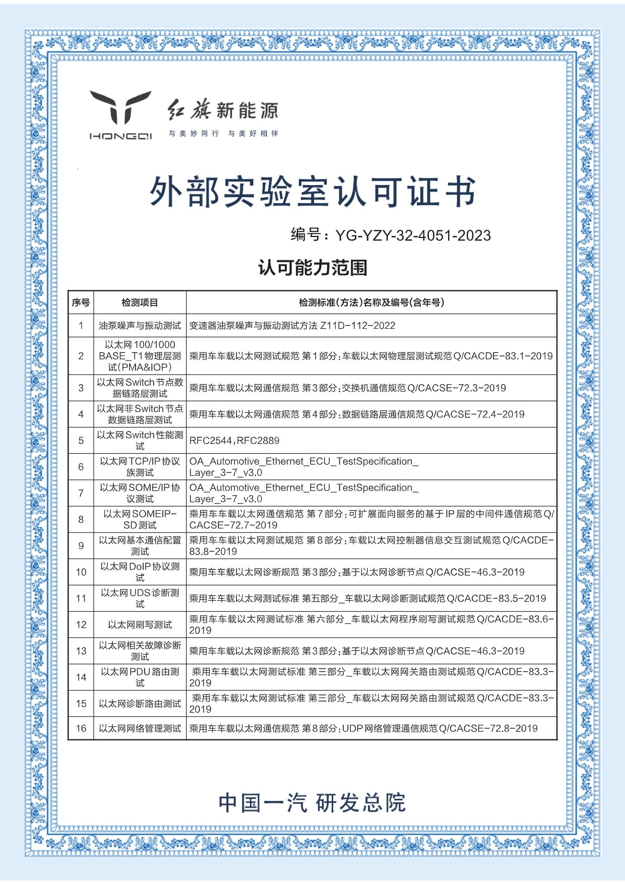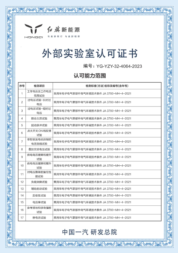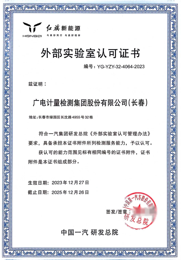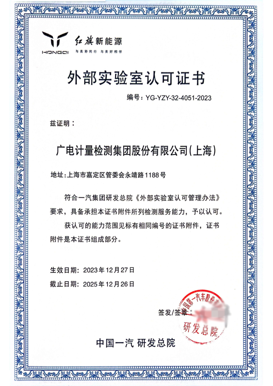 近日,經(jīng)過嚴(yán)格審查,廣電計(jì)量上海、長(zhǎng)春兩地實(shí)驗(yàn)室獲得紅旗新能源外部實(shí)驗(yàn)室認(rèn)可,充分表明了合作伙伴對(duì)廣電計(jì)量技術(shù)能力、實(shí)驗(yàn)設(shè)備、人才團(tuán)隊(duì)、質(zhì)量管控等全方位綜合實(shí)力的肯定,為后續(xù)深入合作打下了重要基礎(chǔ)。