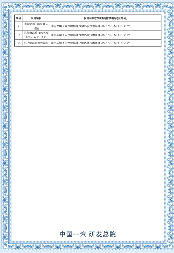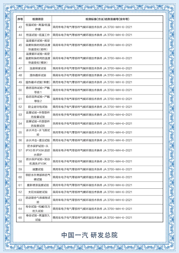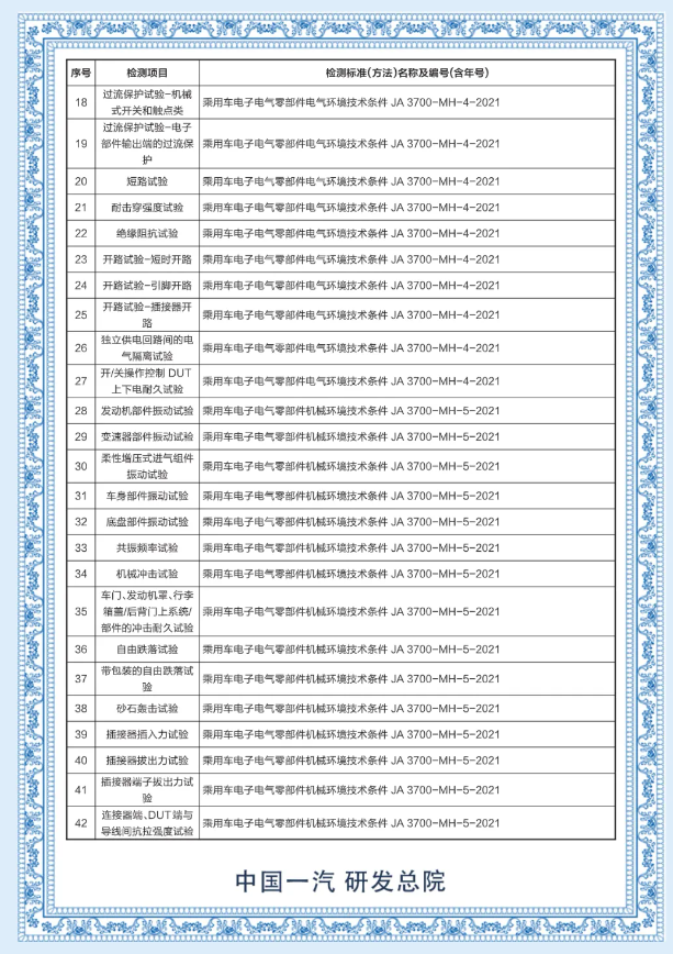 電子電器測(cè)試貫穿汽車開發(fā)過程,可充分驗(yàn)證各零部件、子系統(tǒng)、整車的功能,保障汽車安全性和舒適性。長(zhǎng)春實(shí)驗(yàn)室認(rèn)可范圍覆蓋電氣負(fù)荷、機(jī)械負(fù)荷、氣候負(fù)荷、化學(xué)負(fù)荷等電子電器測(cè)試項(xiàng)目,成為國(guó)內(nèi)極少數(shù)可以執(zhí)行紅旗新能源電子電器測(cè)試能力的第三方檢測(cè)機(jī)構(gòu)實(shí)驗(yàn)室之一。