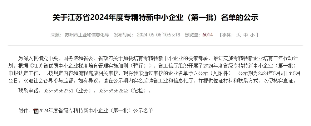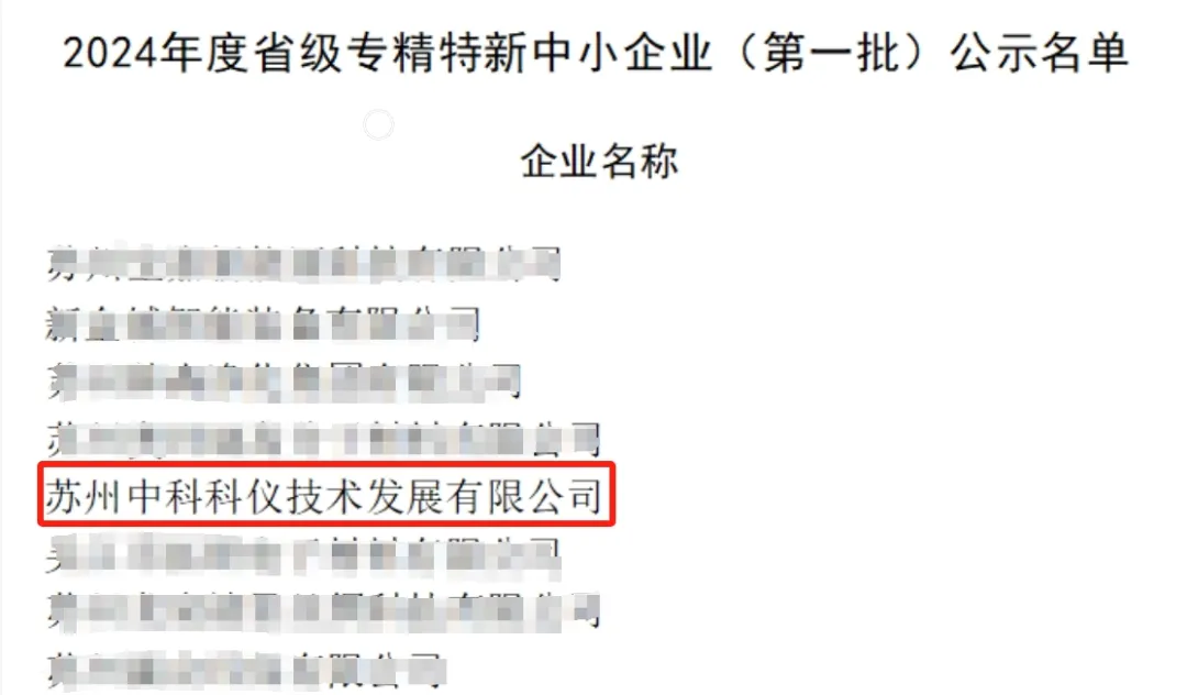 2024年5月6日,蘇州市工業(yè)和信息化局發(fā)布《關(guān)于江蘇省2024年度專精特新中小企業(yè)(第一批)名單的公示》文件,蘇州中科科儀技術(shù)發(fā)展有限公司成功入選。