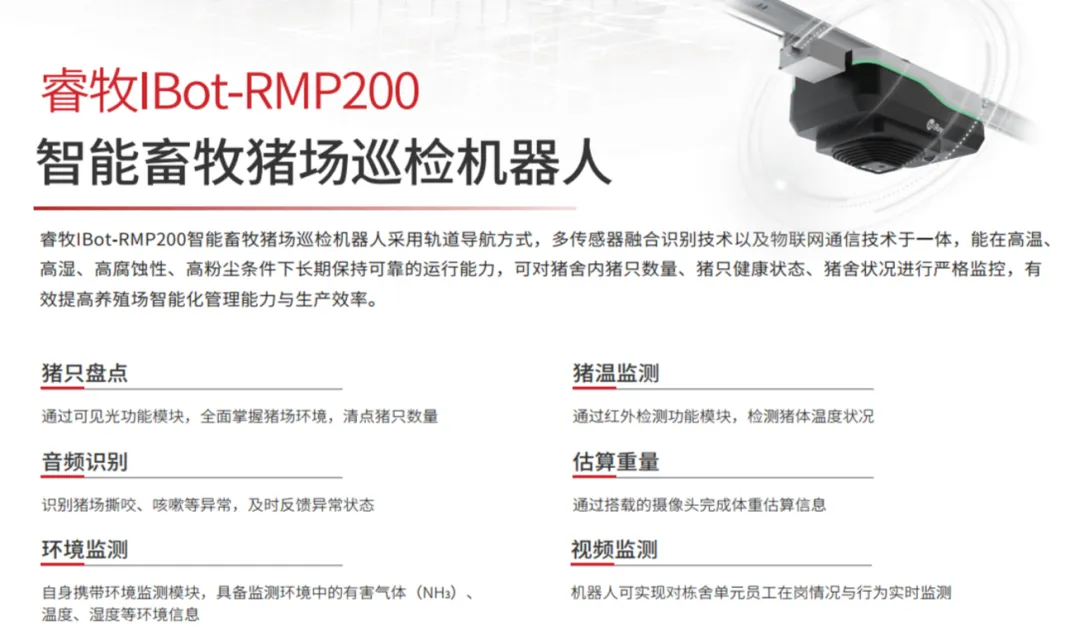 睿創(chuàng)微納自主研發(fā)的IBot-RMP200智能畜牧豬場(chǎng)巡檢機(jī)器人,輕量化設(shè)計(jì),實(shí)現(xiàn)了豬只數(shù)量統(tǒng)計(jì)、豬只重量估算、發(fā)燒豬篩選識(shí)別、音頻識(shí)別、遠(yuǎn)程視頻/巡診、智能環(huán)控等功能,為“非瘟”等疫情的早期發(fā)現(xiàn)提供了有效方案。