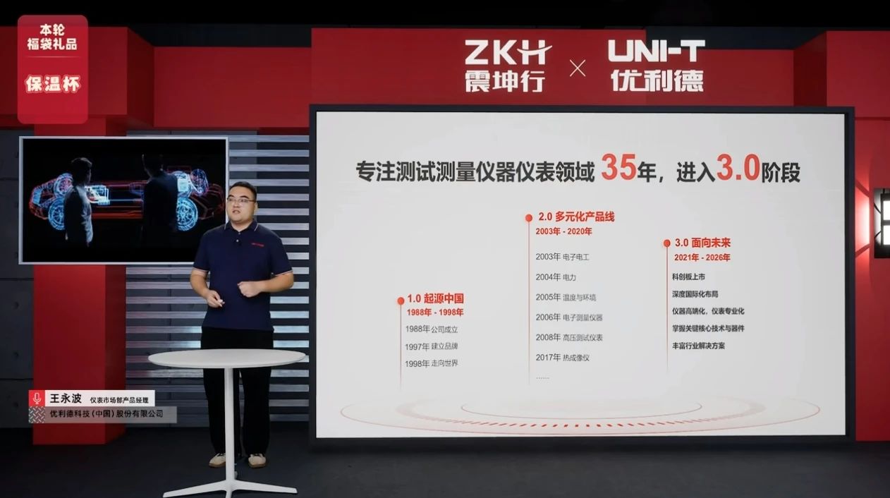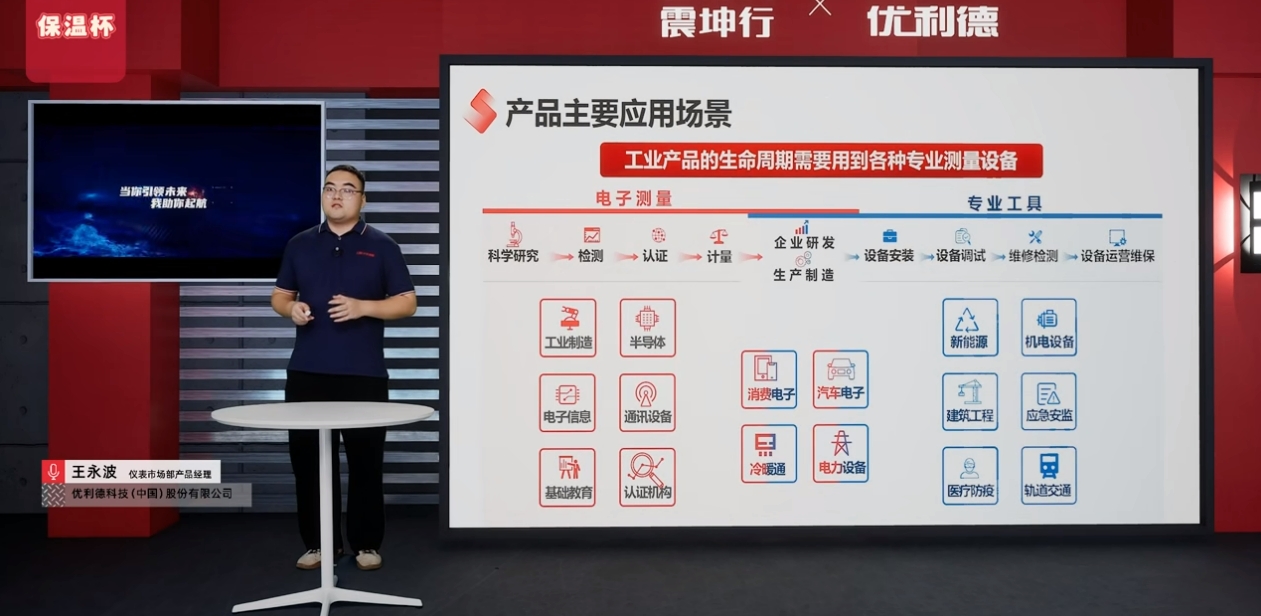 企業(yè)介紹環(huán)節(jié),優(yōu)利德測試儀表市場部產(chǎn)品經(jīng)理王永波作為主講嘉賓,詳細介紹了優(yōu)利德的發(fā)展歷程、核心產(chǎn)品線、產(chǎn)品應用場景、企業(yè)競爭優(yōu)勢與宏偉愿景等。他指出,優(yōu)利德是一家集儀器儀表自主研發(fā)、生產(chǎn)、銷售為一體的國家高新技術企業(yè),主要向全球用戶提供通用儀表、專業(yè)儀表、溫度及環(huán)境測試儀表、測試儀器等多元化產(chǎn)品與綜合解決方案,全力保障工業(yè)產(chǎn)品全生命周期的穩(wěn)健與安全。