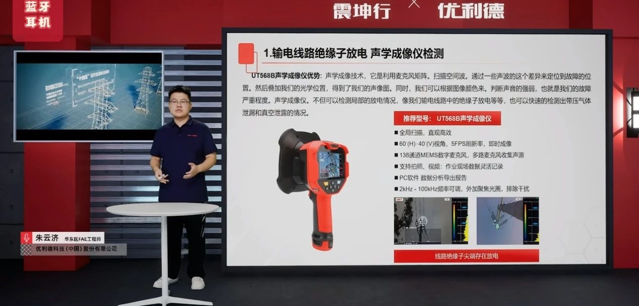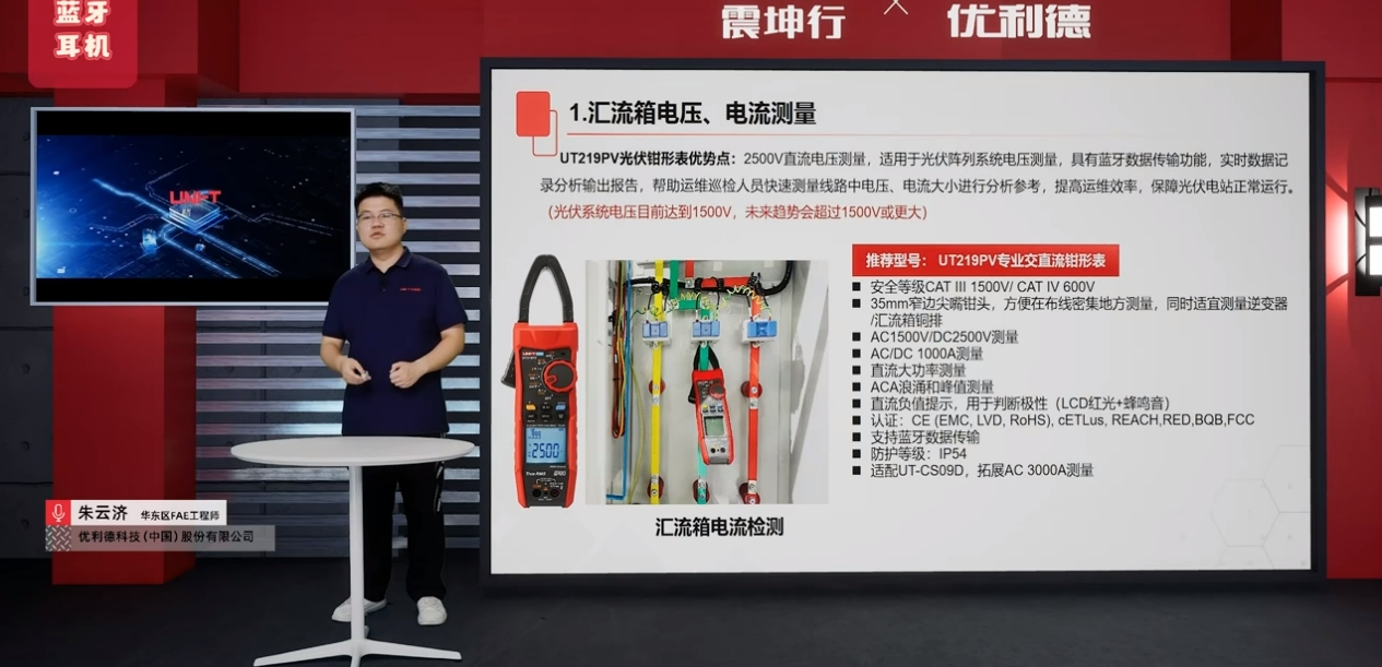 隨后,優(yōu)利德華東區(qū)FAE工程師朱云濟重點推介了公司的兩大行業(yè)解決方案——《光伏發(fā)電站運行維護解決方案》和《新能源汽車維修解決方案》。他特別強調了優(yōu)利德在聲學成像領域的重磅之作——UT568B手持式聲學成像儀,以及UT673PV光伏組件最大功率測試儀、UT219PV CAT III 1500V真有效值交直流鉗形表、UT503PV光伏絕緣電阻測試儀等產(chǎn)品在光伏電站運維中的出色應用,展示了優(yōu)利德如何通過技術創(chuàng)新解決行業(yè)痛點,為光伏電站的安全運維提供有力支持。