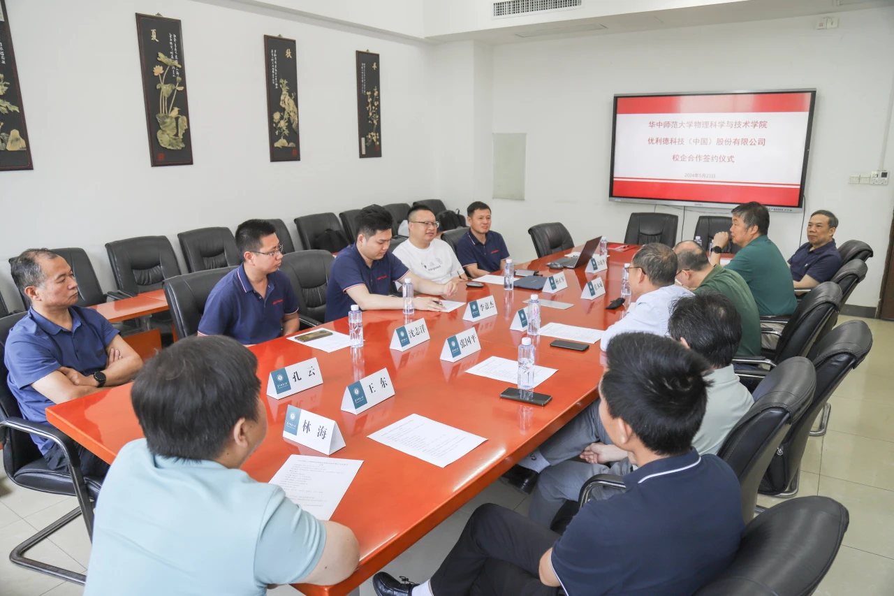 為探索多元化校企合作模式,積極推進(jìn)產(chǎn)學(xué)研深度合作,促進(jìn)研究生培養(yǎng)、本科生實(shí)習(xí)和畢業(yè)生就業(yè),5月23日,優(yōu)利德科技(中國)股份有限公司與華中師范大學(xué)物理科學(xué)與技術(shù)學(xué)院在華中師范大學(xué)九號教學(xué)樓535會議室舉行校企合作簽約儀式。優(yōu)利德公司人力資源總監(jiān)楊正軍、華中區(qū)銷售總監(jiān)金戰(zhàn)華、儀器市場部經(jīng)理李嘉杰、華中區(qū)銷售經(jīng)理沈志洋和華中師范大學(xué)物理科學(xué)與技術(shù)學(xué)院院長張本威、副院長黃光明、吳少平、電信學(xué)科專業(yè)教師骨干劉守印、張國平、王東、林海等參加簽約儀式,交流會由黃光明主持。