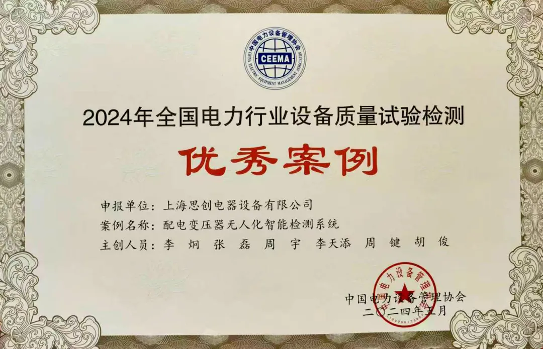 2024年5月23日至24日,上海市計(jì)量協(xié)會(huì)電力專委會(huì)副主任單位上海思創(chuàng)電器設(shè)備有限公司(以下簡稱上海思創(chuàng))總經(jīng)理朱斌一行赴北京參加了2024年全國電力行業(yè)設(shè)備管理工作會(huì)議。會(huì)上,上海思創(chuàng)“配電變壓器無人化智能檢測系統(tǒng)”項(xiàng)目榮獲2024年全國電力行業(yè)設(shè)備質(zhì)量試驗(yàn)檢測優(yōu)秀案例。
