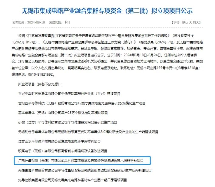 近日,無錫市發(fā)展和改革委員會公布了2024年度無錫市集成電路產(chǎn)業(yè)融合集群專項資金(第二批)項目擬立項項目公示名單。廣電計量檢測(無錫)有限公司(簡稱:無錫廣電計量)建設(shè)的“芯片可靠性驗證及失效分析測試綜合技術(shù)服務(wù)平臺項目”獲批立項,將為無錫集成電路產(chǎn)業(yè)高質(zhì)量發(fā)展貢獻技術(shù)力量。