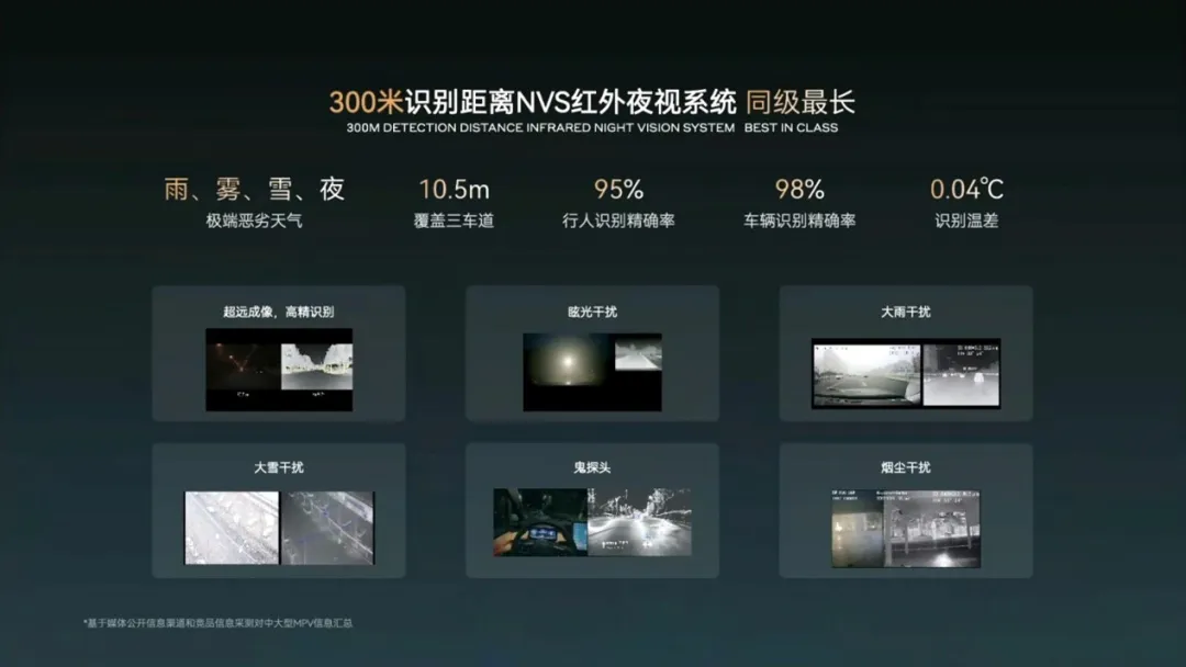 值得一提的是,主動安全方面L380搭載的堪比偵察無人機的“NVS超視距智能紅外夜視系統(tǒng)” 由睿創(chuàng)微納精心打造。300m識別距離NVS紅外夜視系統(tǒng)同級最長,保證用戶“看的”更清晰;10.5m超寬視野至少覆蓋3車道;行人識別精準(zhǔn)率95%;車輛識別精準(zhǔn)率98%。相比于一般感知方案,NVS紅外夜視能掃除光照不良及風(fēng)雪雨霧等惡劣天氣影響,實現(xiàn)抗眩光干擾、抗霧霾干擾、抗雨雪干擾、抗煙塵干擾。