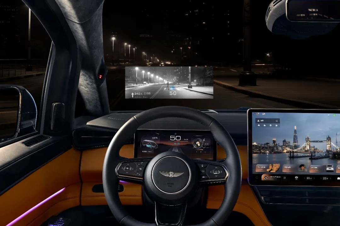 L380還在高端MPV行業(yè)中率先搭載行業(yè)唯一集成顯示AR-HUD,創(chuàng)新性地將A柱盲區(qū)監(jiān)測和夜視影像顯示功能集成其中。
