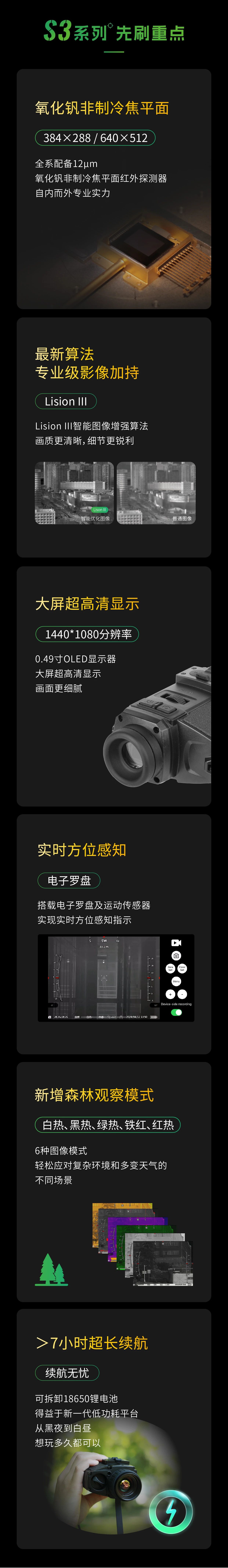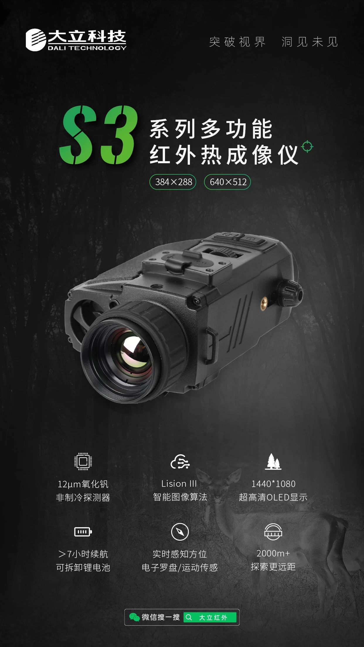 以下是大立科技紅外望遠(yuǎn)鏡產(chǎn)品推薦,S3 系列多功能紅外望遠(yuǎn)鏡,感知強(qiáng)勁夜視屬性,高像素選擇,2000m+探測。