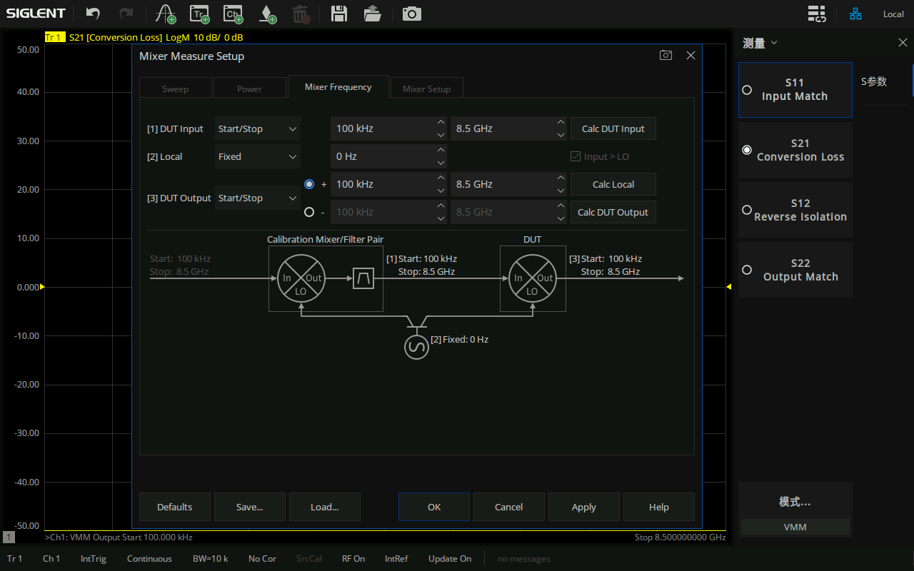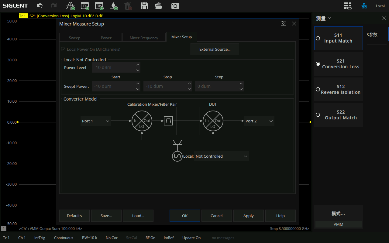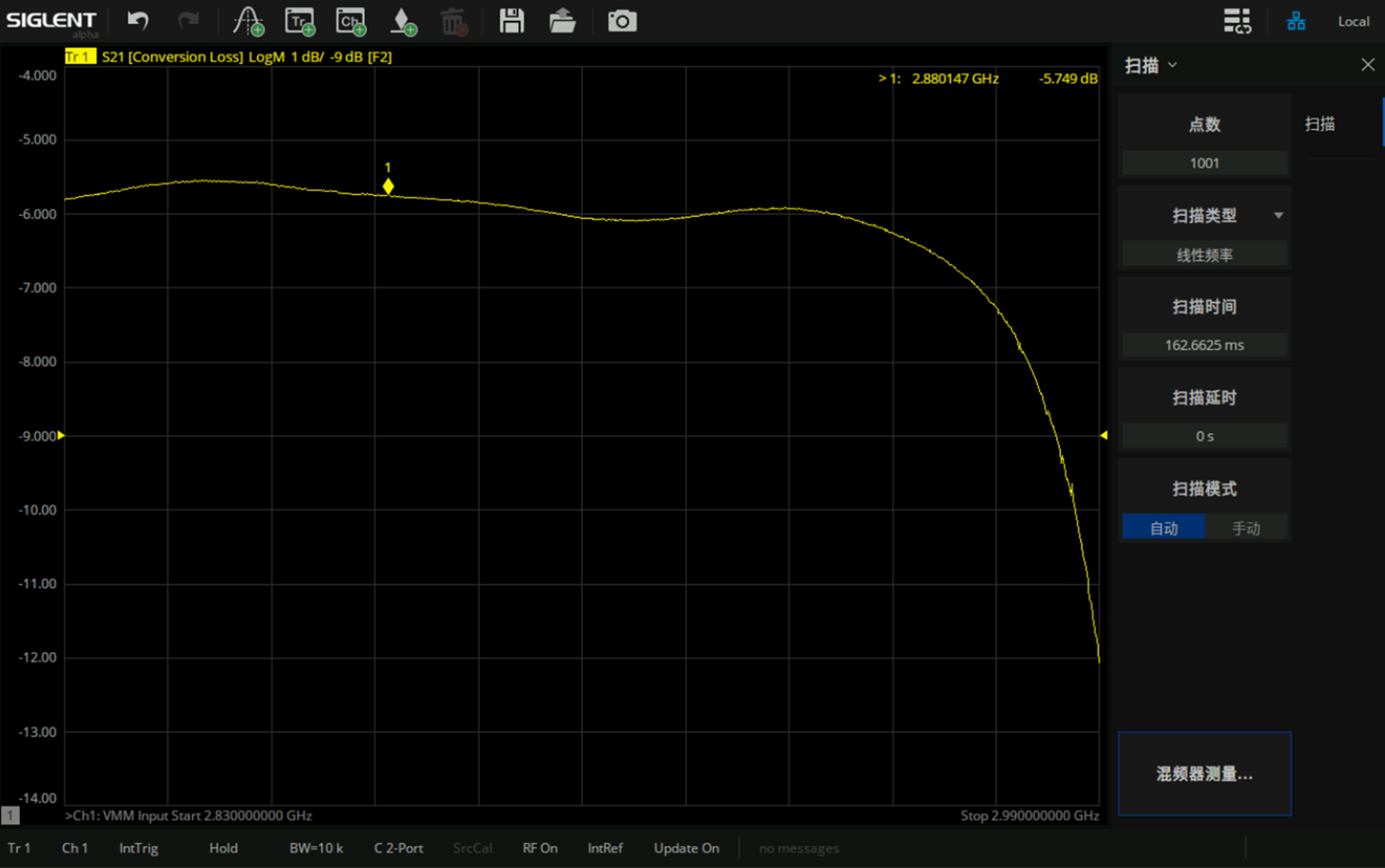 傳統(tǒng)的性能評(píng)估通常只關(guān)注混頻器的端口駐波、隔離度及變頻幅度特性等,矢量混頻測(cè)量則能夠同時(shí)獲取相位和幅度信息。通過(guò)本振固定、輸入和輸出信號(hào)同步掃頻,或輸入信號(hào)固定、本振和輸出信號(hào)同步掃頻,獲得經(jīng)過(guò)校準(zhǔn)的轉(zhuǎn)換損耗/增益、匹配、群時(shí)延以及器件間的相移等結(jié)果。